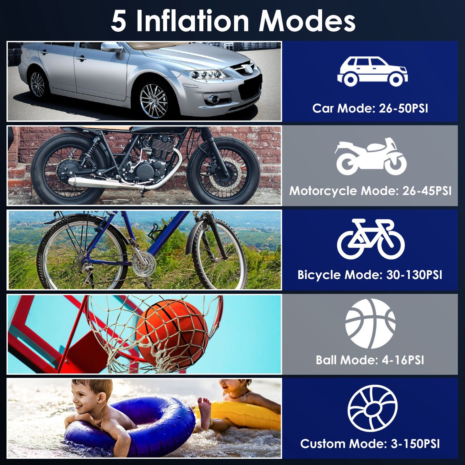 • 5 Inflation Modes: Car, Motorcycle, Bicycle, Ball, Custom Mode