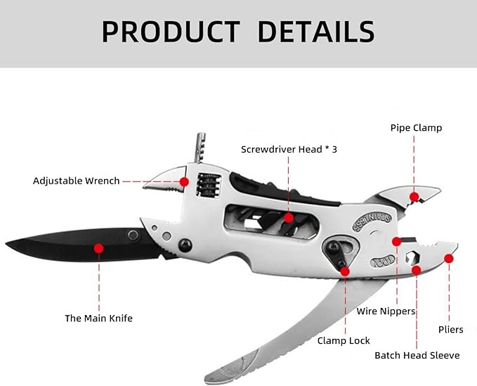• 6-in-1 multitool with pliers, wrench, knife, screwdriver, wire cutter, and sleeve holes