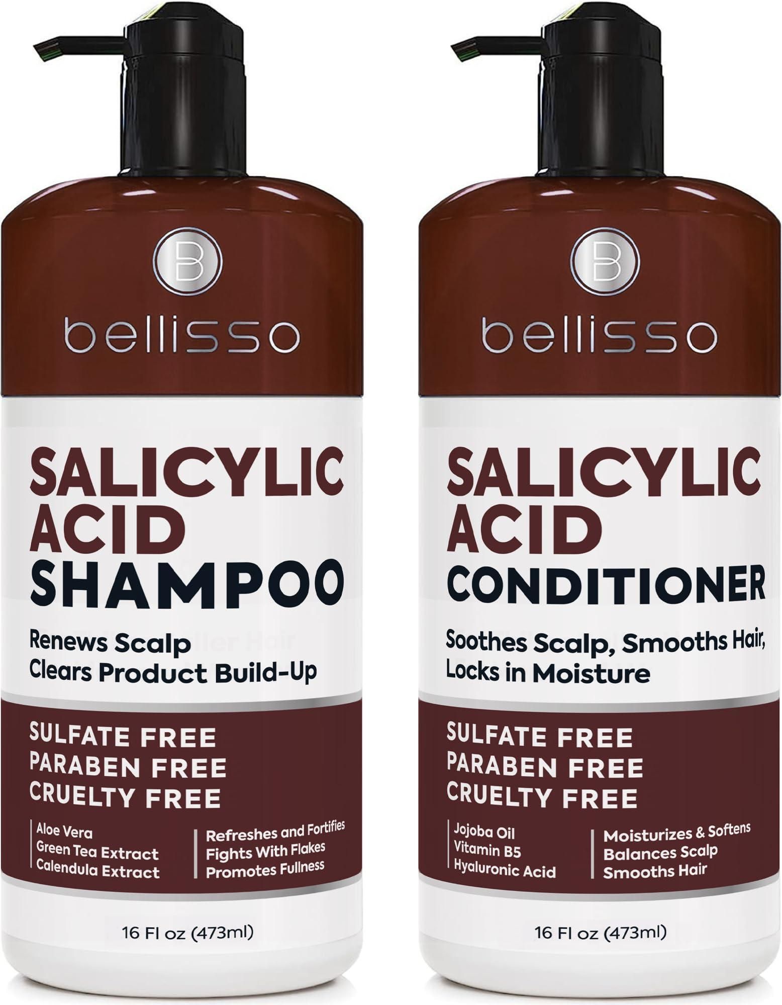 1.exfoliates and clears buildup: this salicylic acid shampoo and conditioner set gently exfoliates the scalp, removing dead skin cells, excess oil, and product buildup. bellissos dry scalp treatment works to cleanse deeply, leaving hair feeling light and refreshed. say goodbye to flakes and irritation with this soothing anti dandruff shampoo and conditioner.