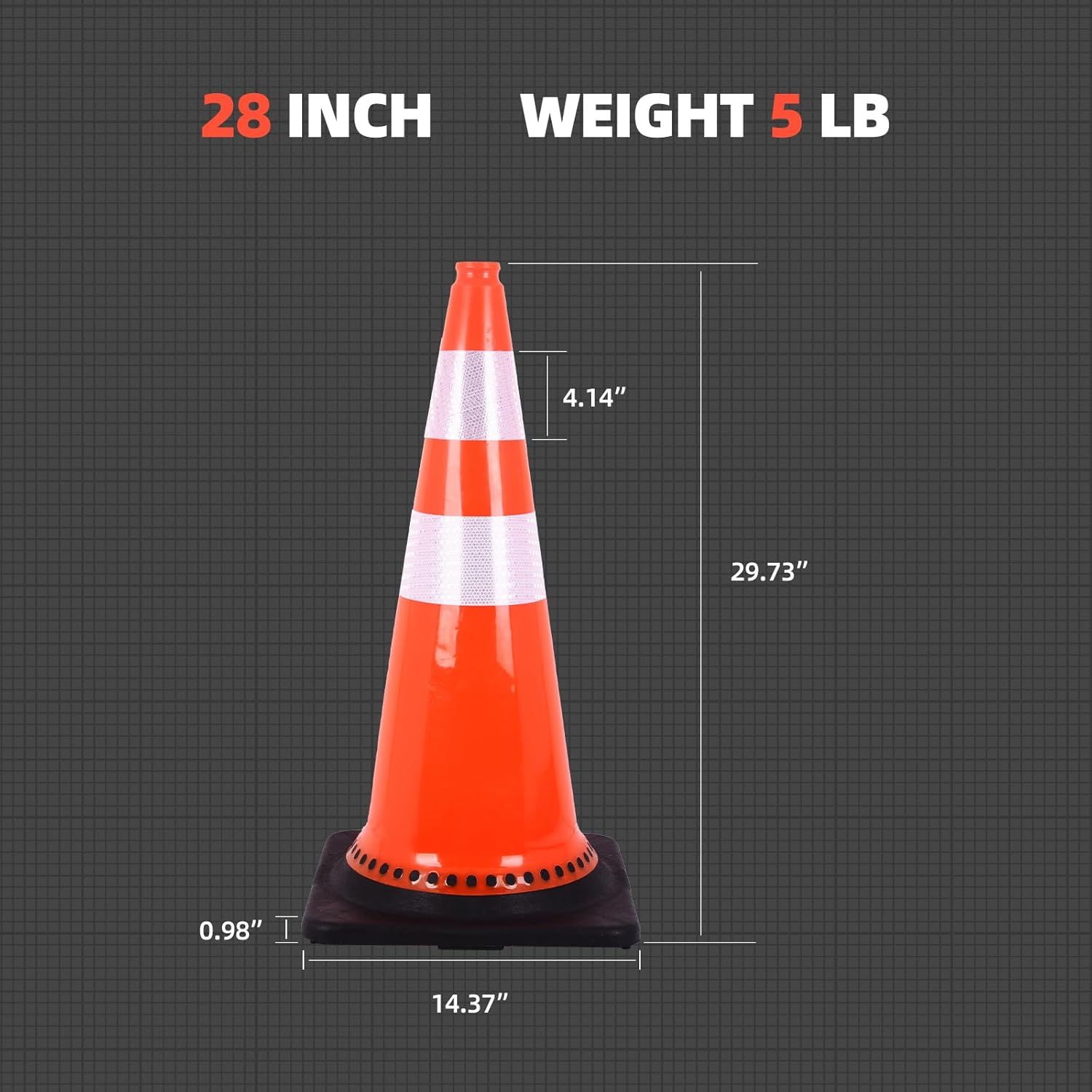 [HIGH-VISIBILITY CONES] Our 28-inch traffic cones come in bright orange with two silver reflective strips to increase safety by clearly marking hazardous areas, allowing the cones to provide a long range warning to vehicles in sunny, rainy, snowy or inclement weather such as nighttime and hail.