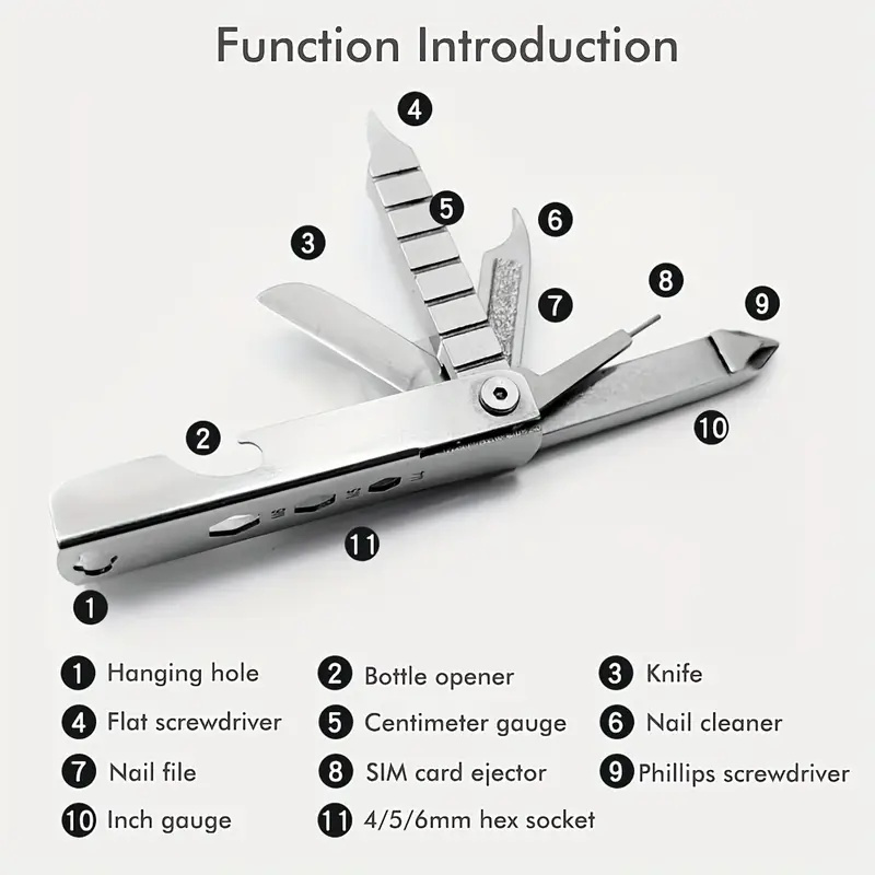 Compact, rugged, and versatile, this 11-in-1 stainless steel multi-tool is designed for survival, preparedness, and everyday emergencies. Small enough to fit in your pocket yet packed with essential functions, it’s the perfect backup tool for bug-out bags, get-home kits, or daily carry. With a folding knife, carabiner clip, screwdrivers, wire stripper, and even a phone stand for hands-free use, this tool is built to keep you ready anywhere.
