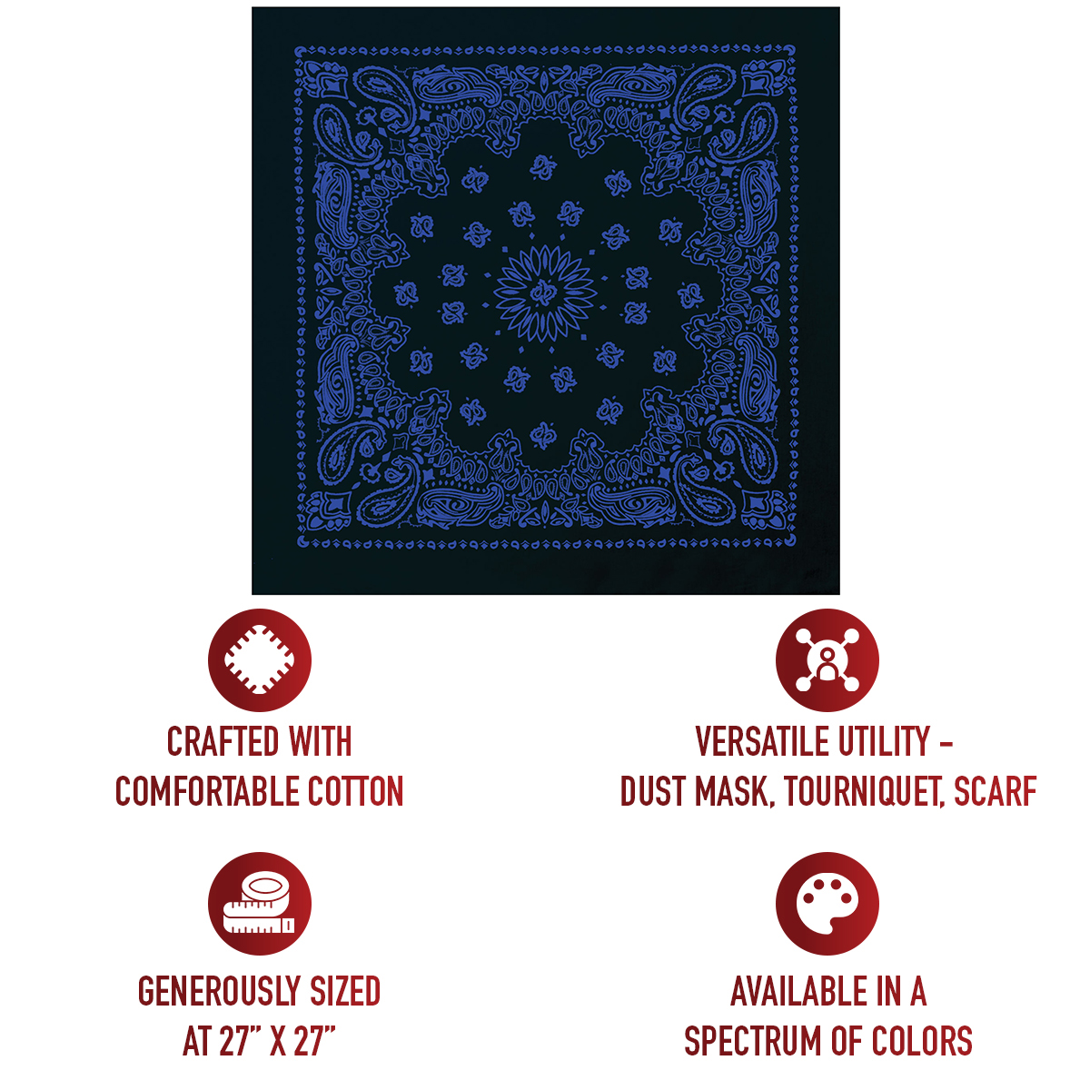 The Trainmen Paisley Bandana is a durable and versatile survival essential designed for protection, utility, and everyday preparedness. Made from 100% breathable cotton, it provides reliable coverage against dust, sun, and debris while maintaining comfort during extended wear. Measuring 27 in x 27 in, it offers expanded coverage and can be worn as a face covering, headwrap, or neck gaiter, and also functions as an improvised tourniquet, sling, pouch, or signal cloth in emergency situations. Lightweight and compact, this bandana is an essential addition to bug-out bags, emergency kits, or everyday carry gear where adaptability is critical.